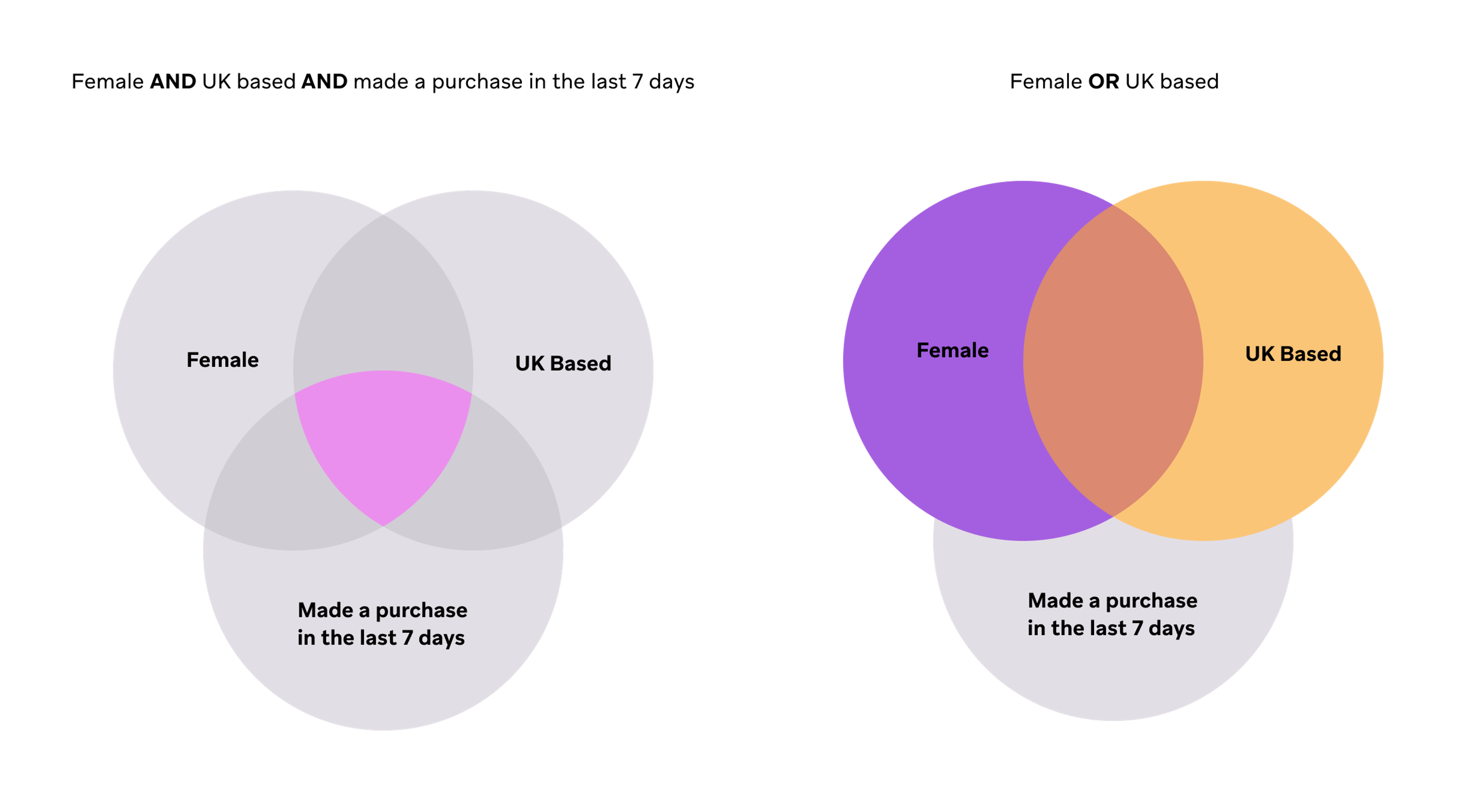 Using the AND operator between three filters, such as "female" AND "UK based" AND "made a purchase in the last 7 days" means users must meet all three conditions to be part of the segment.