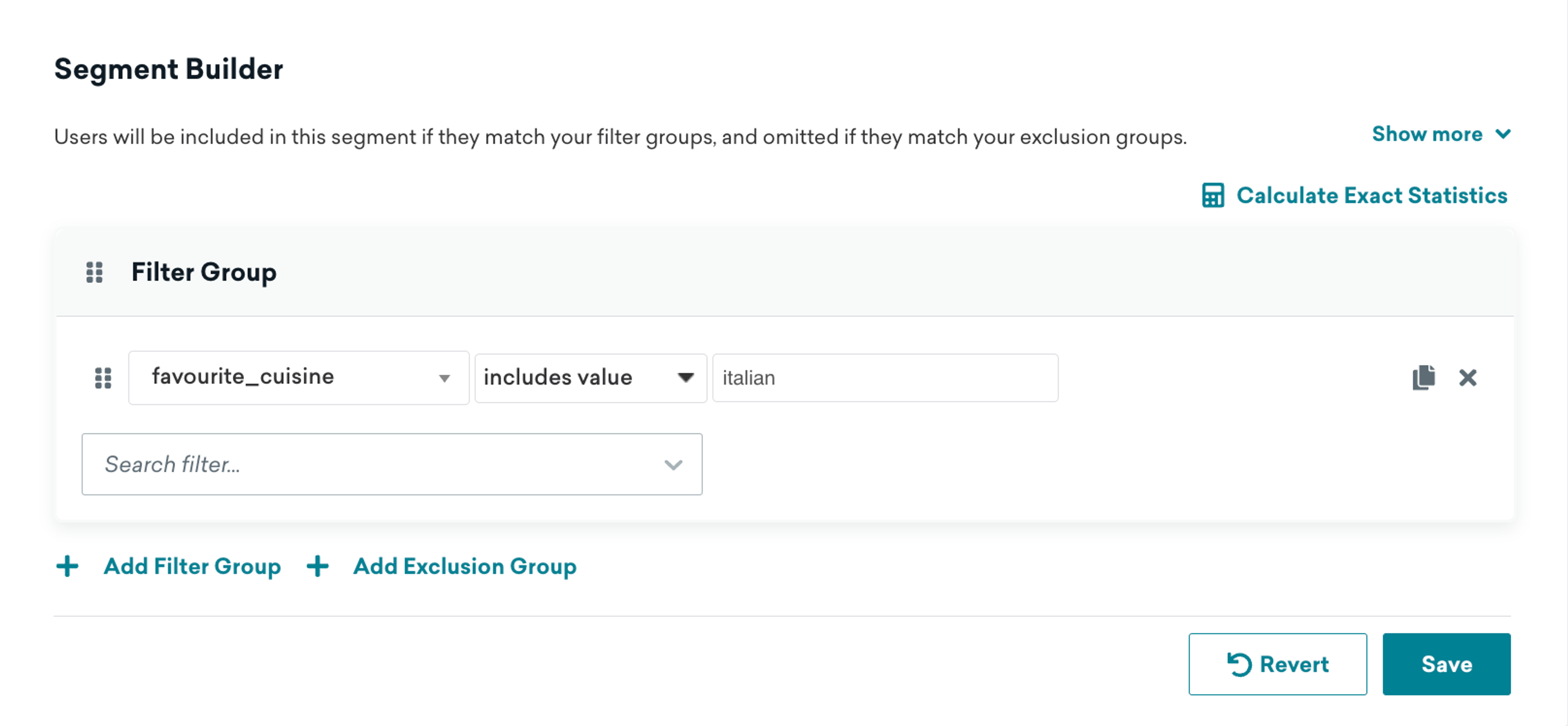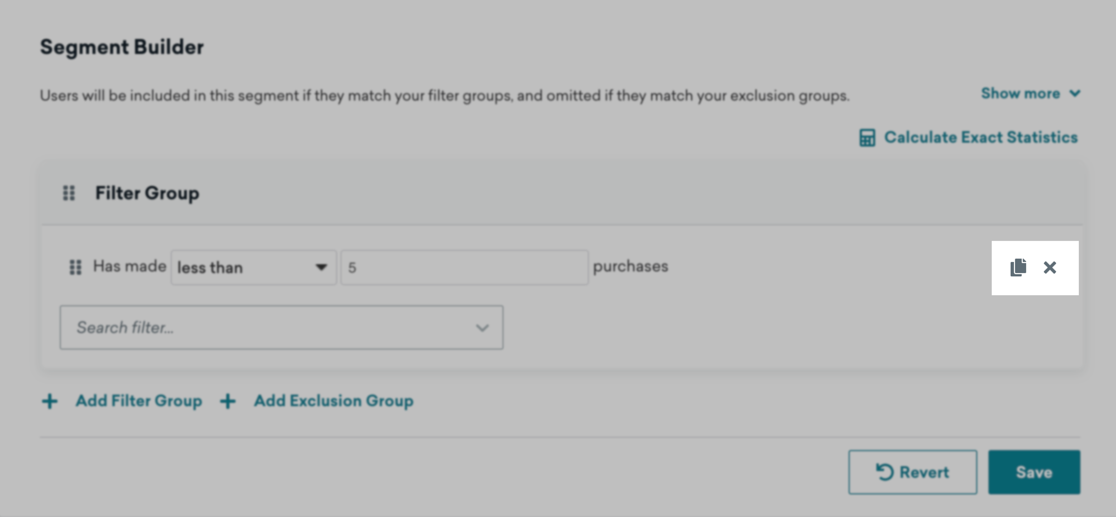 Filter operators tell Braze how to evaluate data from a user's profile to determine if they belong to your segment. For example, an eCommerce brand might want to target customers who have made less than 5 purchases from their brand or spent more than $1,000.