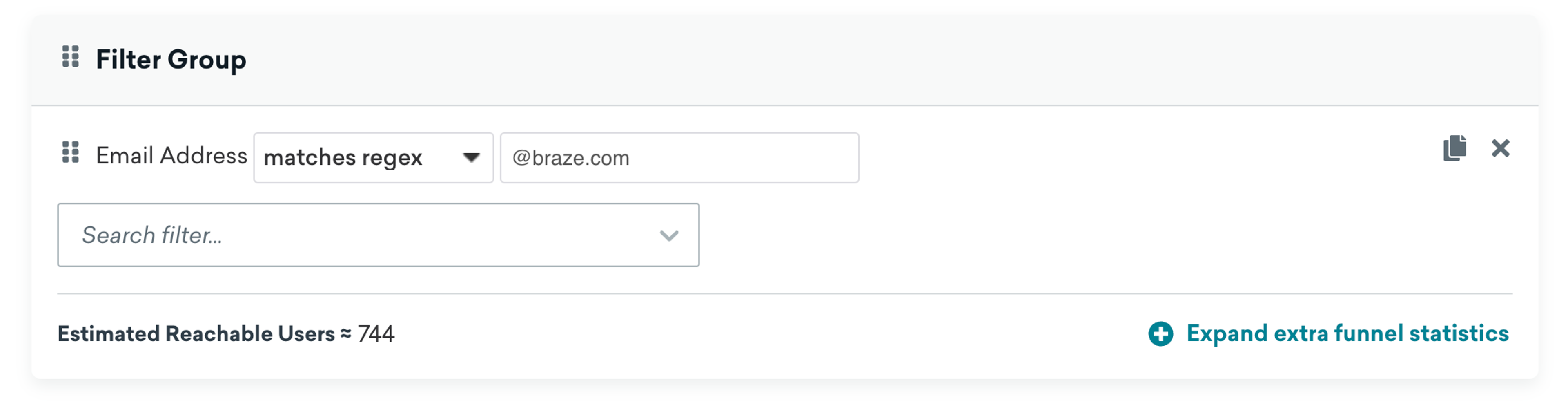 When testing message sending, it can be helpful to create a segment that only contains users in your organization. Use a segment to capture all users from the same domain by combining the Email Address filter with a regex search. Simply using your domain name in the filter should find all the users who have that domain in their email address. For example, to find all test users from Braze, we could use the filter @braze\.com.